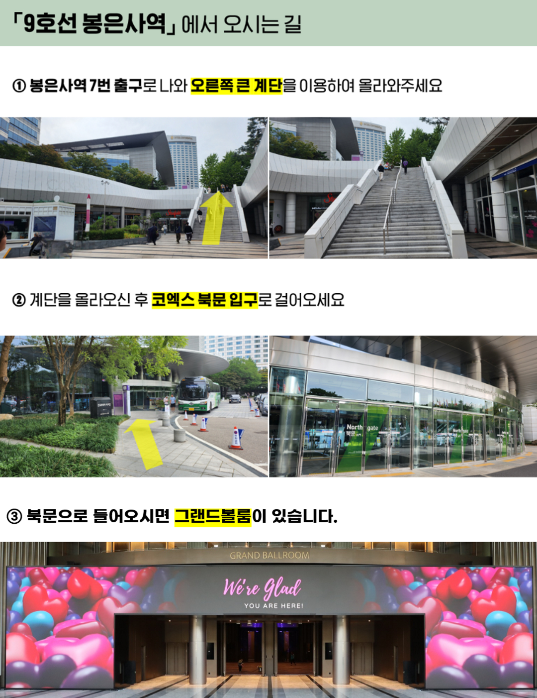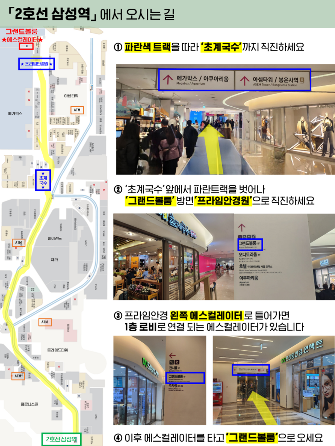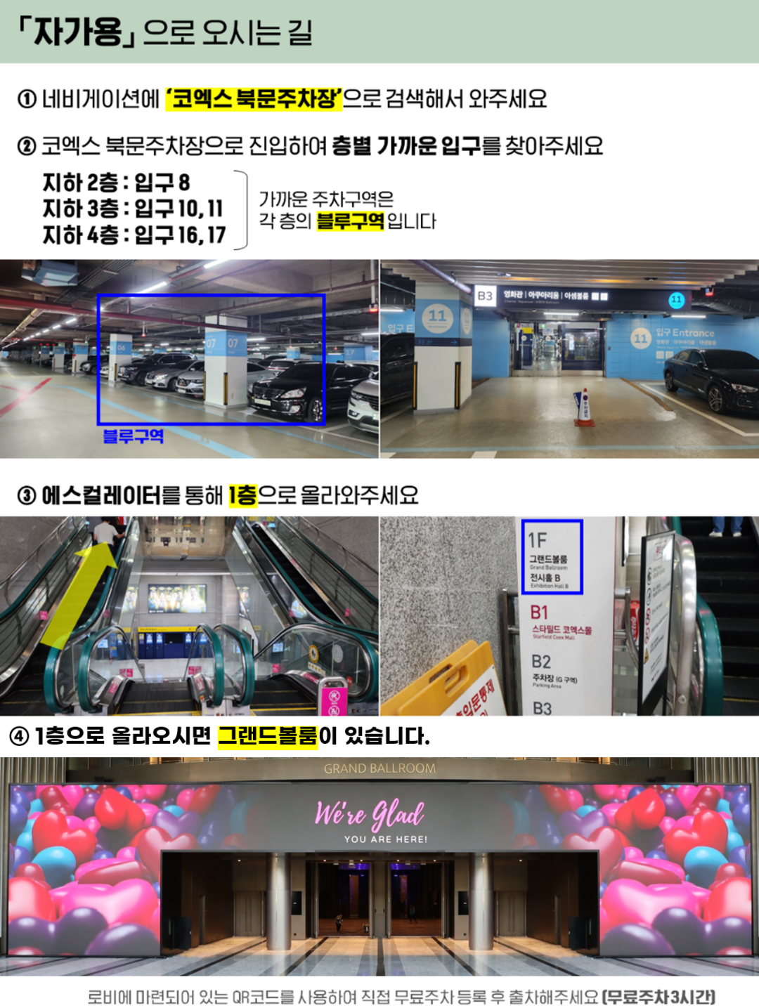 자가용 안내[네비게이션] '코엑스 북문주차장' 으로 검색 봉은사 맞은편 코엑스 '북문주차장' (GATE 4) 로 진입 후 지하 2층~4층 블루구역 주차 (3시간 무료) - 지하 2층 8번 입구 - 지하 3층 11번 입구 - 지하 4층 16번, 17번 입구를 통해 1층 그랜드볼룸으로 오시기 바랍니다. (가까운 주차 구역은 지하 2층의 G구역 / 지하 3층 I, H구역 / 지하 4층 K, J 구역 입니다)